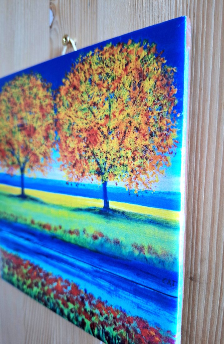 Płytka ceramiczna z kolorowym obrazem mojego autorstwa o wymiarach 15 x 15 cm . To świetlista łąka nad rzeką , pełna bajkowych kwiatów i ciepła . Doskonały pomysł na prezent dla znajomych, rodziny, kolegów z firmy. Płytki mają zawieszkę i naturalny korek na odwrocie , są gotowe do zawieszenia. Płytkę można również wykorzystać jako dekor i przykleić do ściany, połączyć z innymi płytkami, kafelkami. Możliwe jest też oprawienie płytki w stylowe ramki i ustawienie na biurku lub półce.Kilka dekoracyjnych płytek mojego autorstwa wprowadzi światło i kolor i energię do Twojego domu a znajomym sprawi wielką radość. Zobacz więcej malarskich prezentów w sklepie Jacek Caputa Art.
