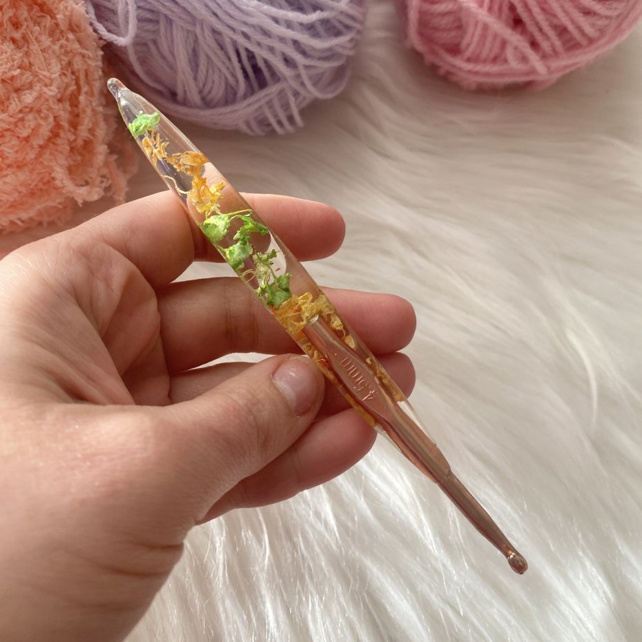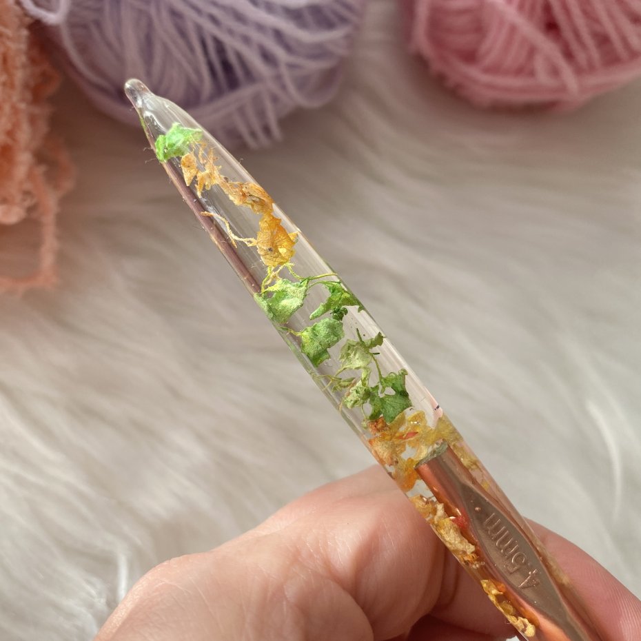 Lubisz oryginalne przedmioty z duszą? To artystyczne szydełko jest właśnie dla Ciebie! Każdy egzemplarz powstaje ręcznie – uchwyt wykonany jest z żywicy epoksydowej, w której zatopione zostały prawdziwe suszone kwiaty. Dzięki temu każde szydełko staje się nie tylko praktycznym narzędziem, ale także małym dziełem sztuki – eleganckim, wyjątkowym i inspirującym.