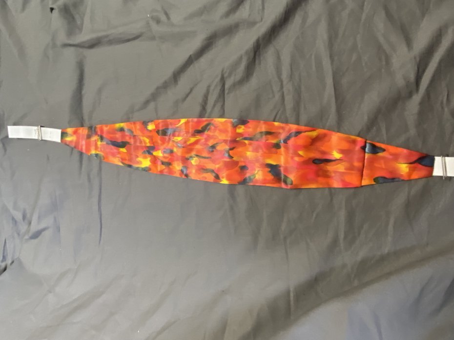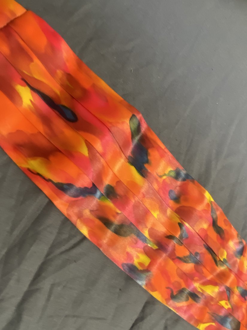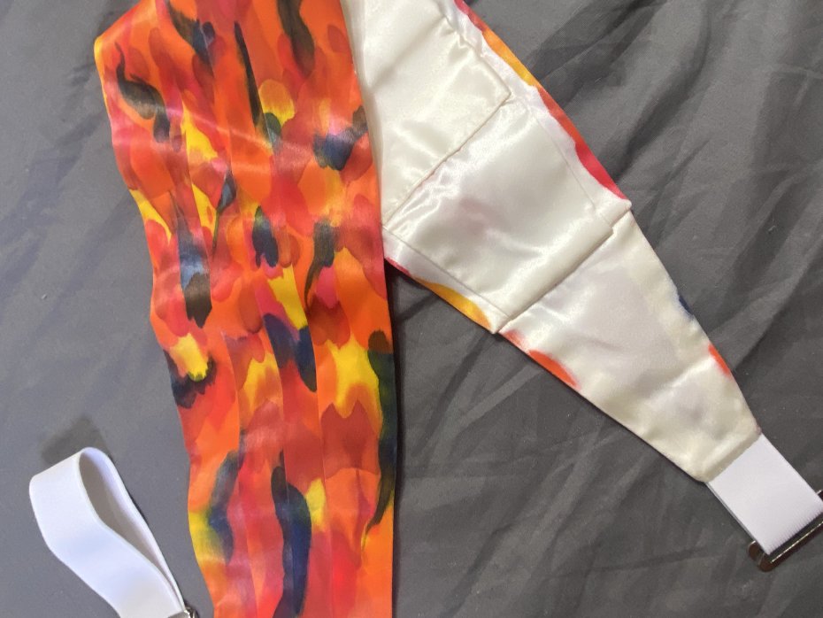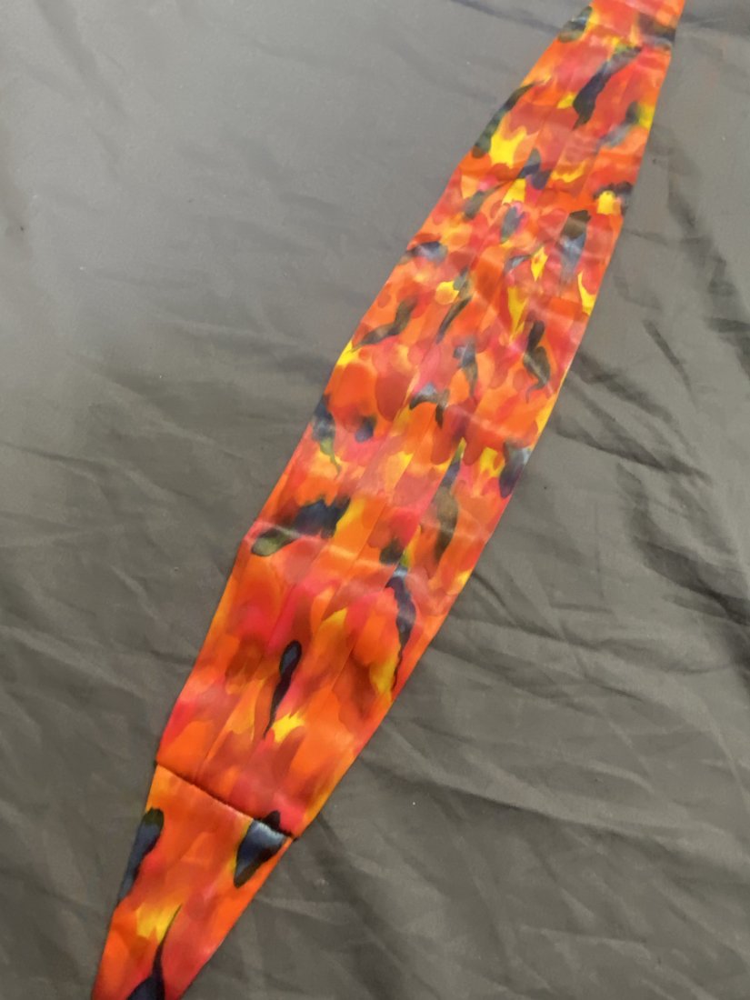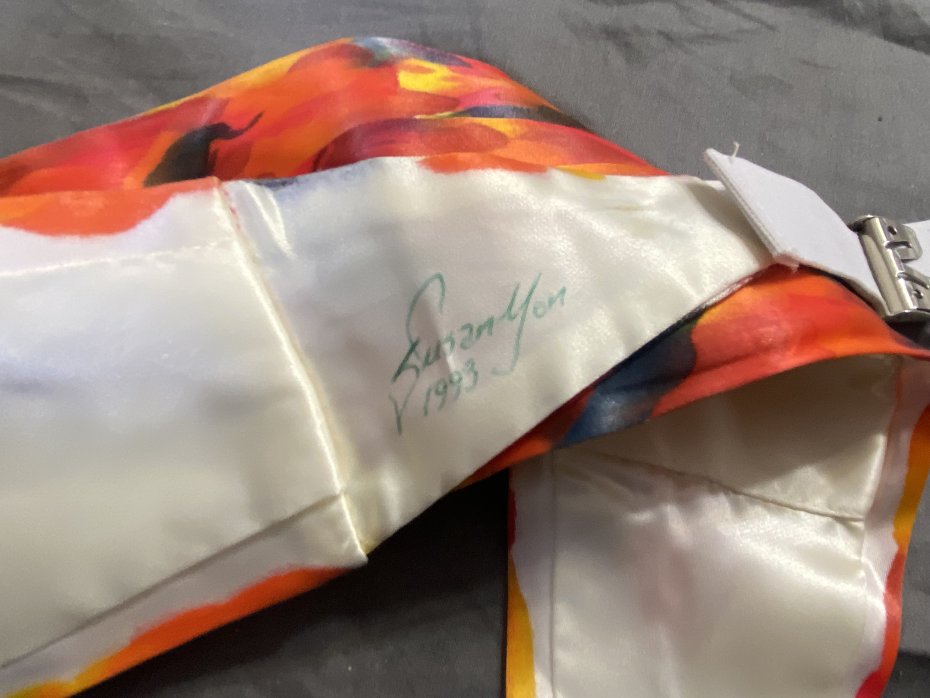 Artystyczny, ręcznie malowy pasek z acetatu satynowego. Wykończony gumą. Uszyty przez artystkę w 1993roku. Susan You.