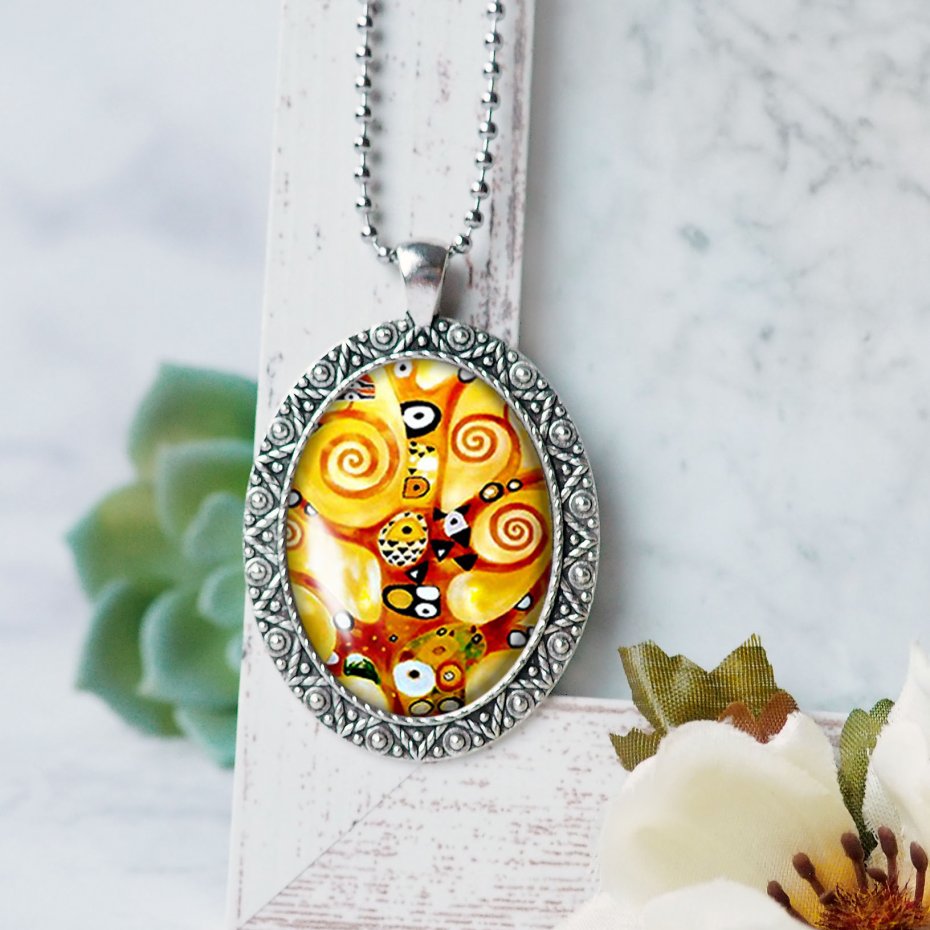 Bardzo efektowny, duży naszyjnik z oryginalną grafiką artystyczną, zatopioną pod wypukłym szkiełkiem dającym efekt 3D, w oprawie w kolorze antycznego srebra. Wisior z grafiką zawieszony na łańcuszku z kuleczek. Grafika jest najwyższej jakości.
