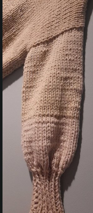 Wykonany na drutach z najwyższej jakości wełny 100% pudełkowy z balonowymi rękawami długość 52 szerokość 58 bez naciagania