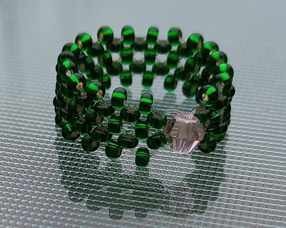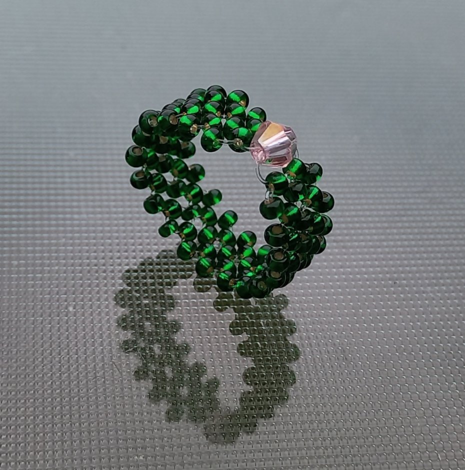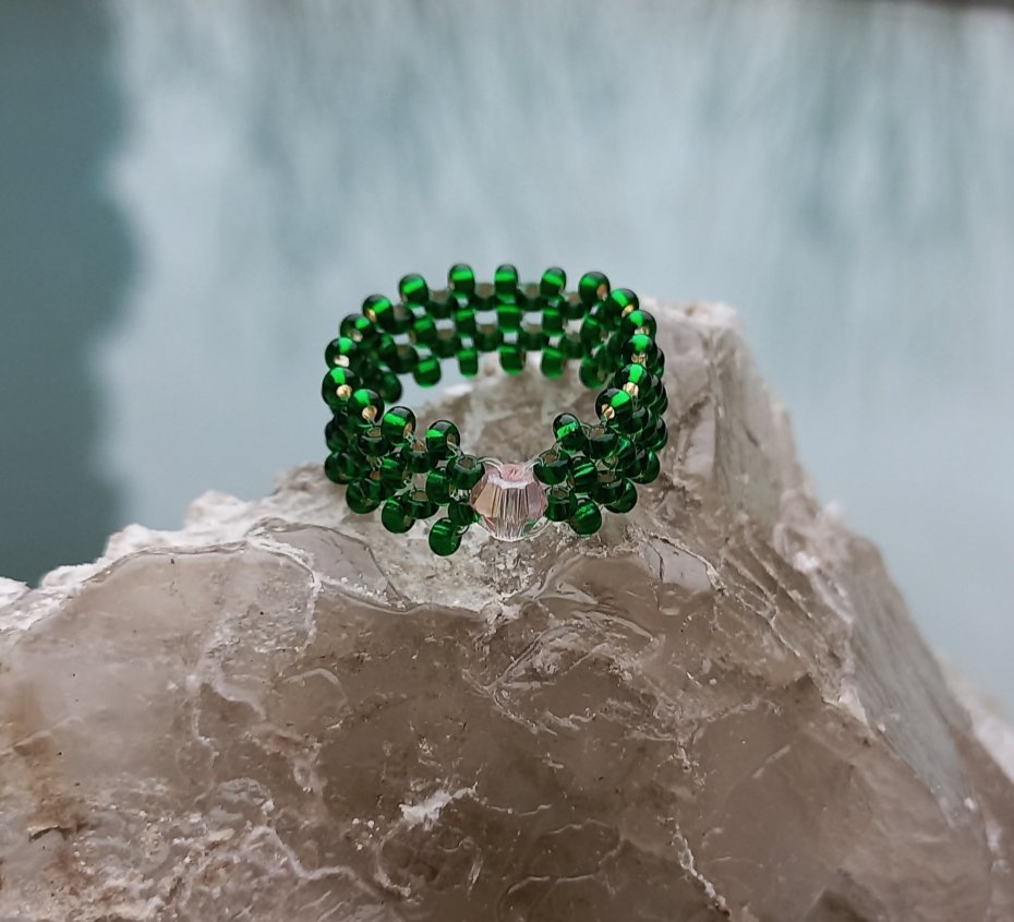 Ręcznie pleciony pierścionek ze szklanych koralików w kolorze soczystej zieleni, zwieńczony lśniącym jasnym kryształkiem.