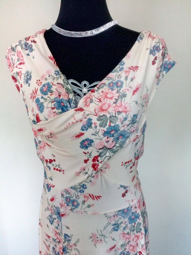 Sukienka z dzianiny viscosowej, tło w kolorze kremowym, wzór kwiatowy w kolorach różowym, niebieskim, niewielkie ilości czerwonego i zieleni. Na ramionach przymarszczona, przód zakładany kopertowo, odcinana w pasie, dół uszyty z sześciu klinów, rozszerzany, materiał podatny, elastyczny