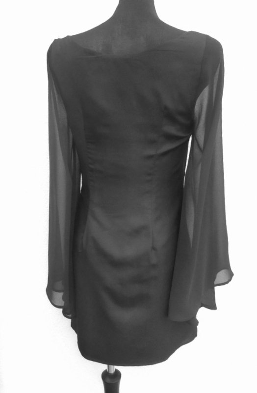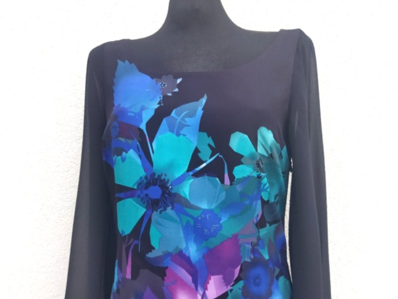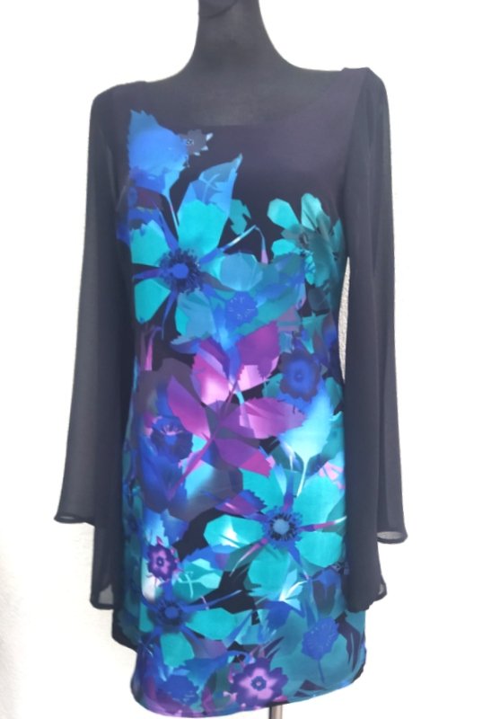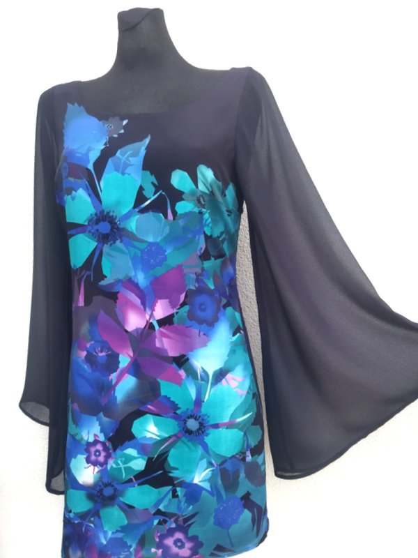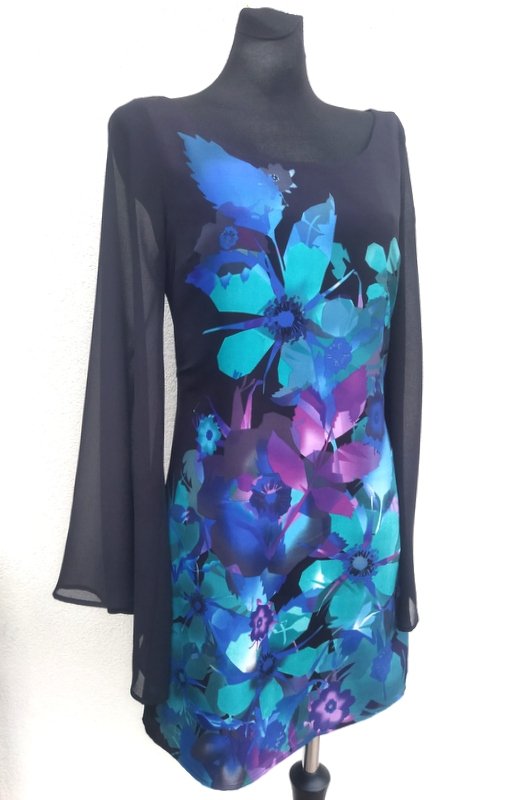 Piękna sukienka z poliestrowej tkaniny w czarnym kolorze z przodem w malowniczy wzór kwiatowy w żywych barwach turkusu, szafiru , szmaragdu , dwóch odcieni fioletu, morskiej zieleni i śladowej ilości bieli. Taliowana , zapinana z boku na zamek. Dużą ozdobą sukienki są fantazyjne rękawy z lekko transparentnej czarnej żorżety poliestrowej wąskie u góry mocno rozkloszowane do dołu. Sukienka na podszewce oprócz rekawów.
