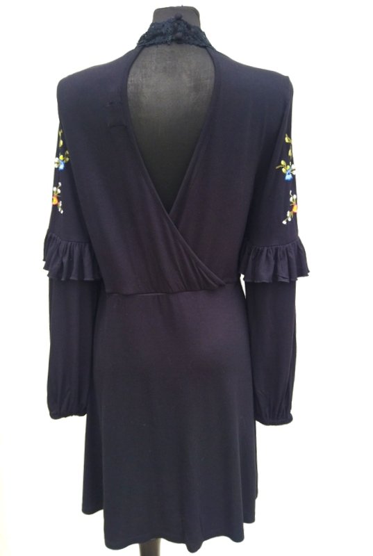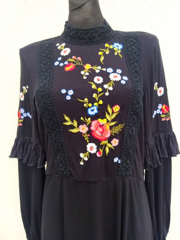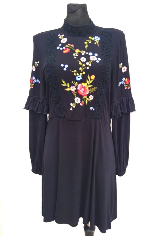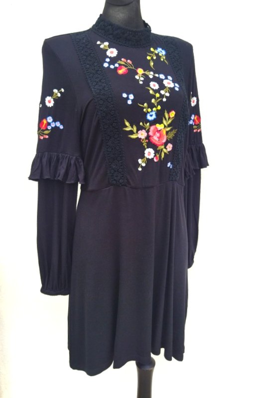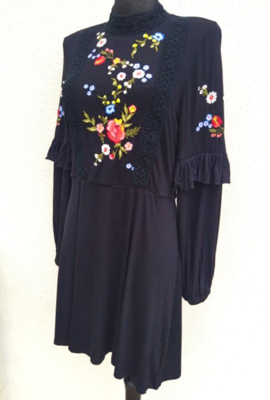 Sukienka z wiskozowej tkaniny dzianinowej w czarnym kolorze zdobiona kolorowym haftem kwiatowym i naszywaną koronkową pasmanteria w czarnym kolorze. Odcinana w pasie, przód zabudowany tył z głębokim dekoltem z kopertowym założeniem, rękawy zdobione falbanka dołem zebrane gumka, dół trapezowy. Bez podszewki - tkanina nie prześwieca .