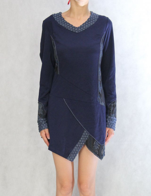 Granatowa tunika/sukienka/długi sweter ze świetnymi wstawkami, asymetryczna. Idealna do obcisłych spodni, legginsów, dla niższej osóbki posłuży także jako sukienka. Firmy M.X.O.
