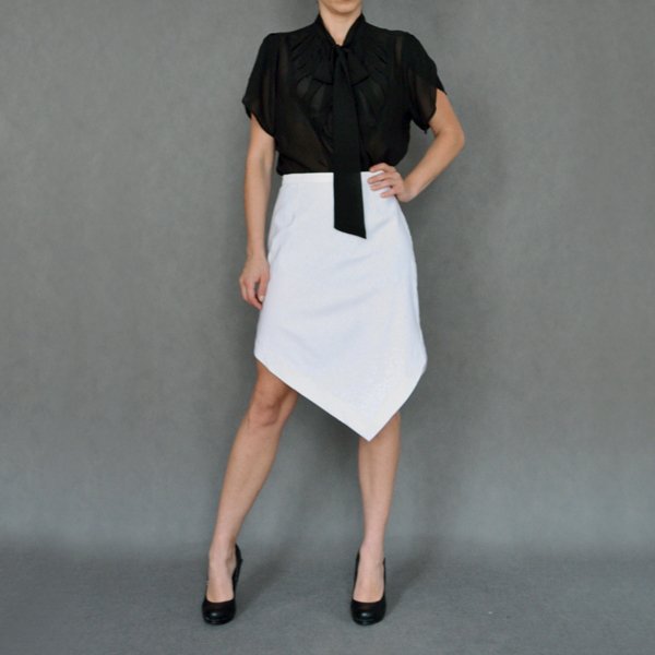 Biała asymetryczna spódnica marki APART. Najdłuższy kant wypada na kolanie. Z boku zapinana na zamek i guzik.