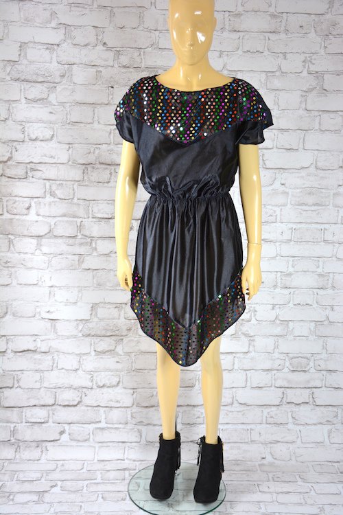 Asymetryczna dłuższa sukienka/tunika wykonana z delikatnie elastycznej tkaniny, w pasie na gumce, zarówno dół jak i linia dekoltu zdobiona cekinami.