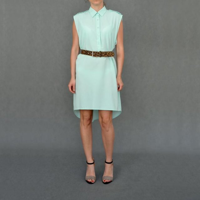 świetna asymetryczna miętowa sukienka od GINY TRICOT. Tył dłuższy. Góra z kołnierzykiem i zapinana na kilka guziczków. Do noszenia z paskiem lub luźno. Polecam bardzo.