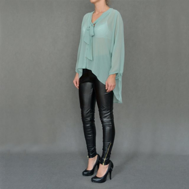Mgiełka Atmosphere w miętowym kolorze. Asymetryczna, dłuższy tył. Pod szyją kokarda. Polecam.