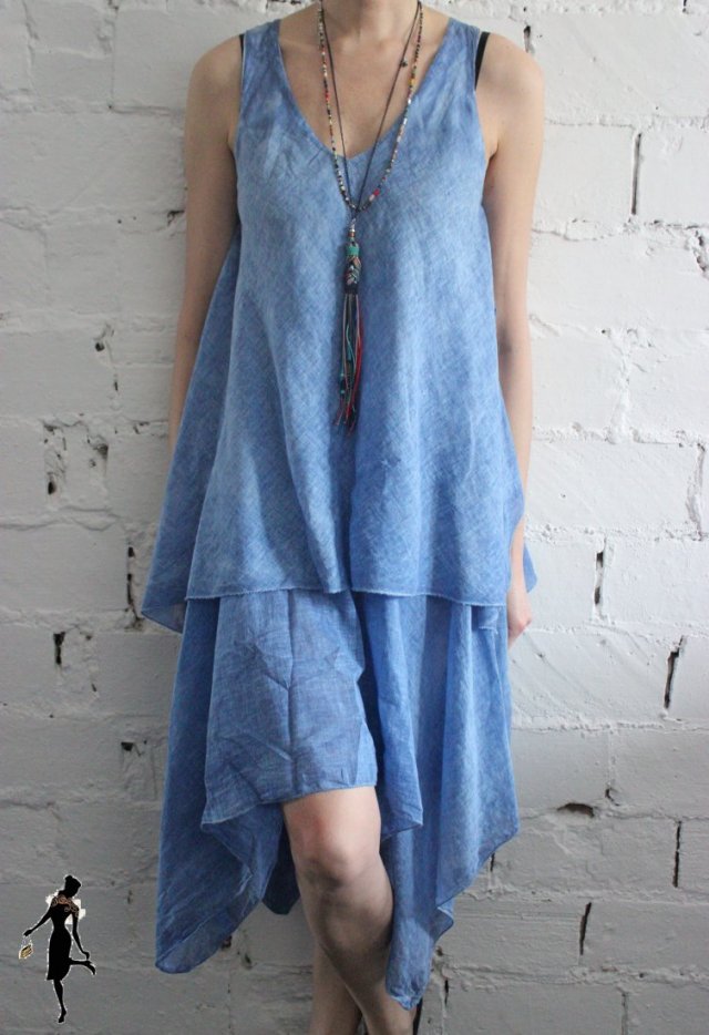 Asymetryczna, dwuwarstwowa, włoska sukienka. Rozmiar uniwersalny. Wymiary: obwód biustu-54cmx2, obwód pasa-58cmx2, obwód bioder-90cmx2, długość sukienki-97cm/128cm. Skład materiału: 100% bawełna.