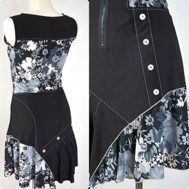 Świetna czarna sukienka o delikatnie asymterycznym kroju w szaro-biało- czarne kwiaty ( tkaniny łączone), z przodu długi suwak, z boku zdobiona guzikami, u dołu z jednego boku sukienki zaszewki tworzące większe plisy, z drugiego boku wstawki kwiatowe - tył również zdobiony guzikami, plisami i wstawkami kwiatowymi.Śliczna.