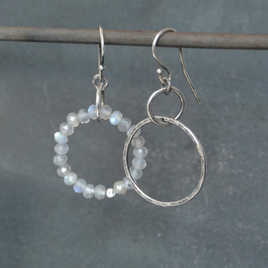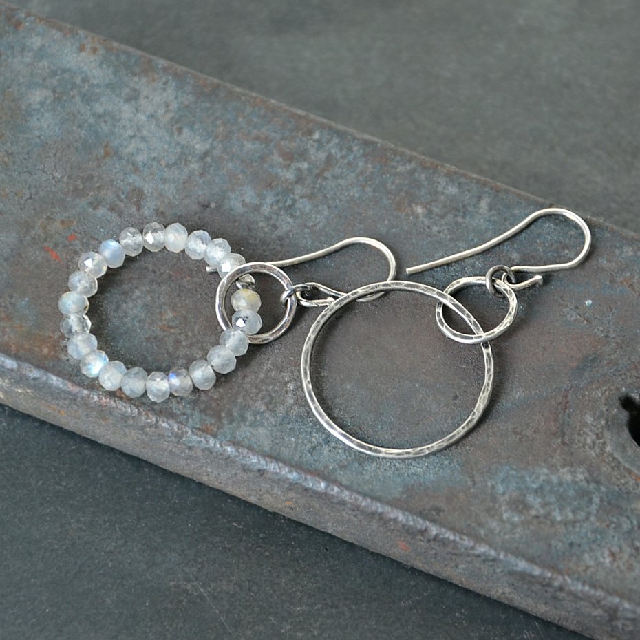 Lekkie kolczyki koła idealne do asymetrycznych fryzur. Jeden z kolczyków został w całości wykonany z ręcznie formowanych młotkowanych kół, a drugi z drobnych naturalnych labradorytów.