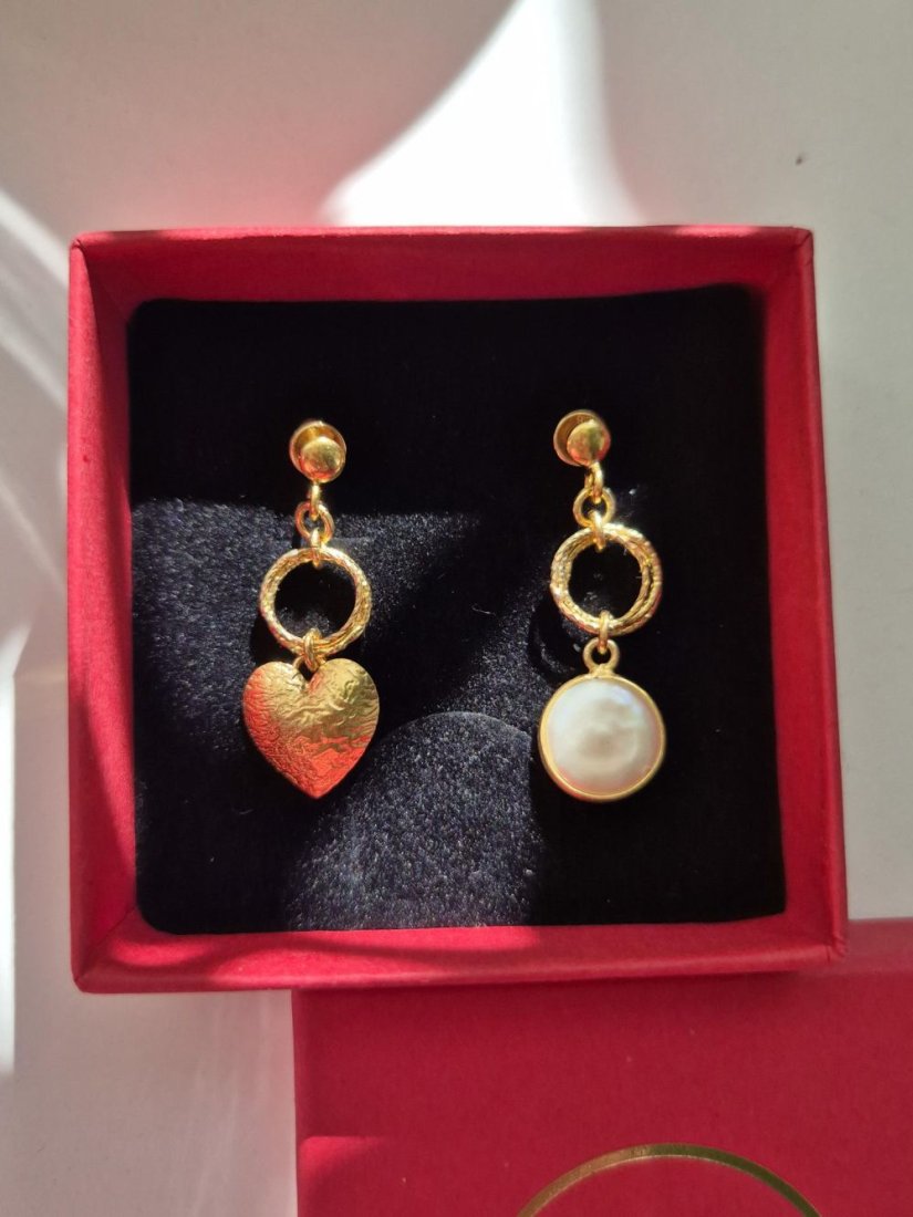 Asymetryczne, wiszące kolczyki wykonane w całości z pozłacanego srebra próby 925 to wyjątkowy dodatek dla odważnych i stylowych kobiet. Na delikatnych, brzęczących diamentowych kółeczkach zawieszono perłę i serduszko ze szczotkowanego srebra, tworząc intrygujące połączenie elegancji i nowoczesności. Idealne dla wielbicielek niebanalnych, dynamicznych stylizacji! Doskonale komponują się zarówno z codziennymi zestawami, jak i wieczorowymi kreacjami, dodając im oryginalnego charakteru. Te kolczyki to subtelny, ale wyrazisty akcent, który przyciąga spojrzenia.