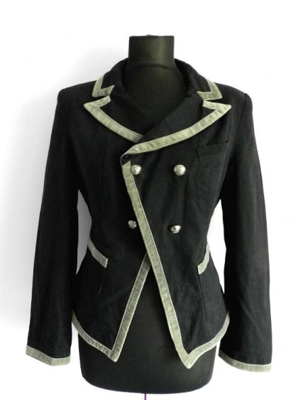 Dwurzędowe 4 guziki z herbem, przóda asymetryczny, dekolt w serek z kołnierzem, brzegi wykończone szarym zamszem, po bokach kieszenie,