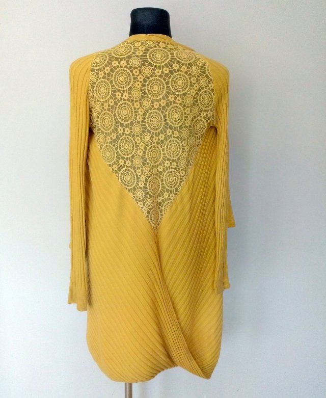 Ciekawy sweter w żółtym kolorze, wykonany ściegiem ściągaczowym, na plecach koronka, u dołu tyłu fantazyjnie przepleciony, rękawy wąskie, przód asymetryczny, z mocno zachodzącymi na siebie połami, fason bez zapięcia