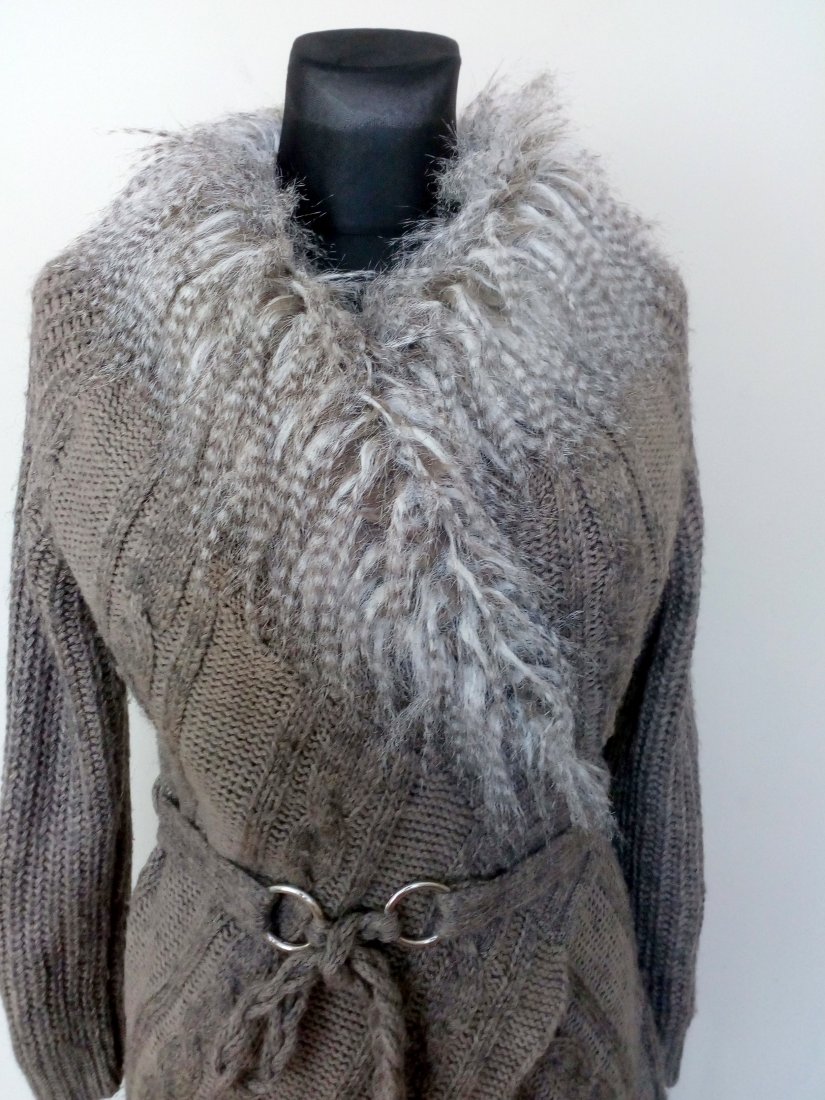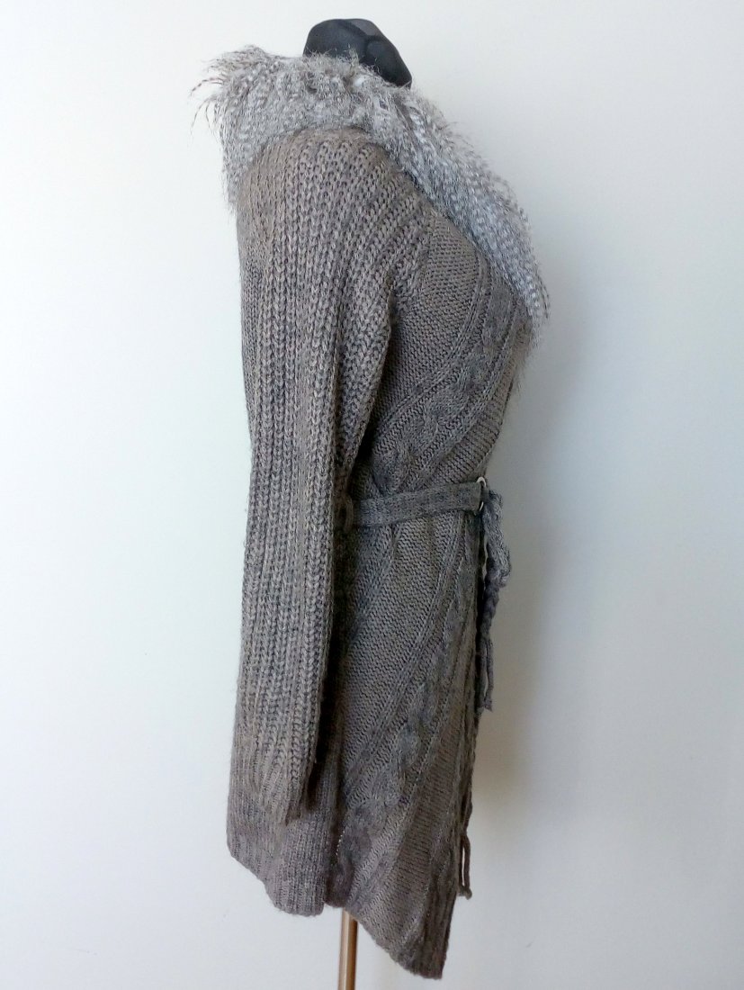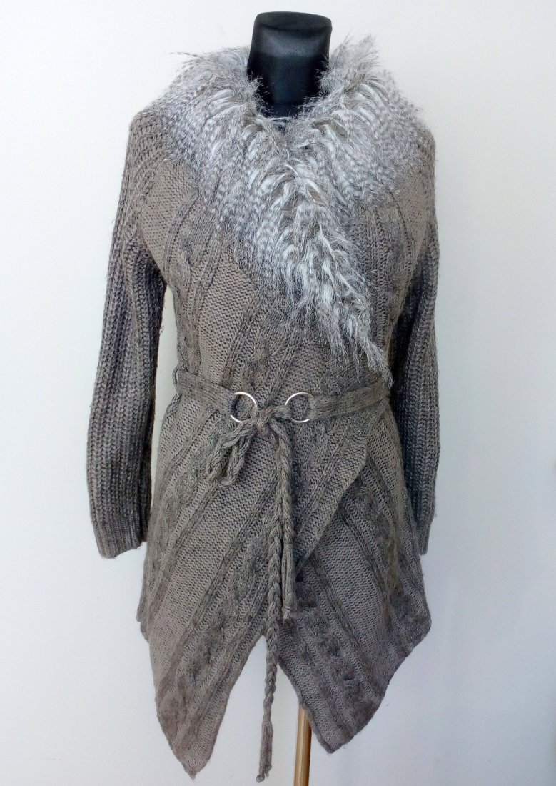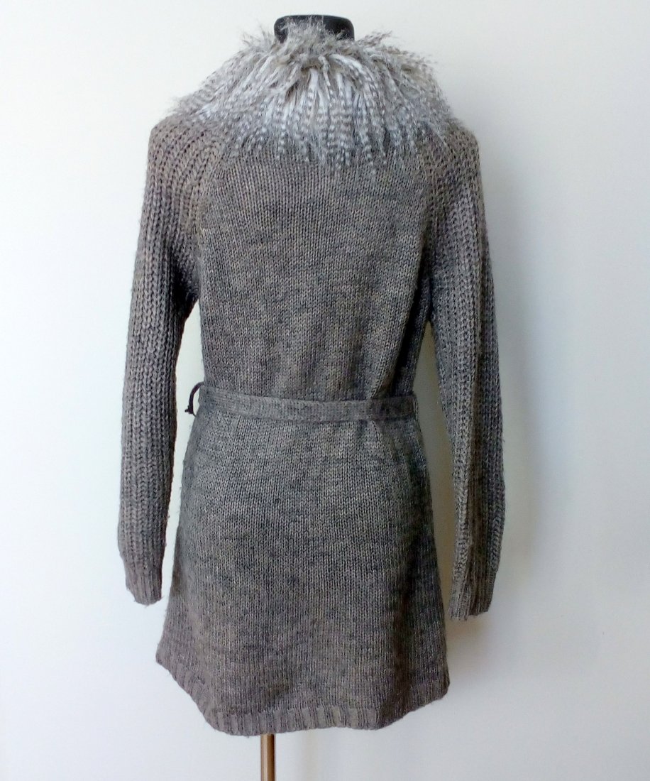 Ładny, wełniany sweter z dodatkiem jedwabiu, z szalowym futrzanym kołnierzem, z przodu zakładany kopertowo i zapinany po boku na dwa metalowe zatrzaski, w pasie szlufki i pasek do wiązania, przód z warkoczowym wzorem, rękawy raglanowe, całość bez podszewki