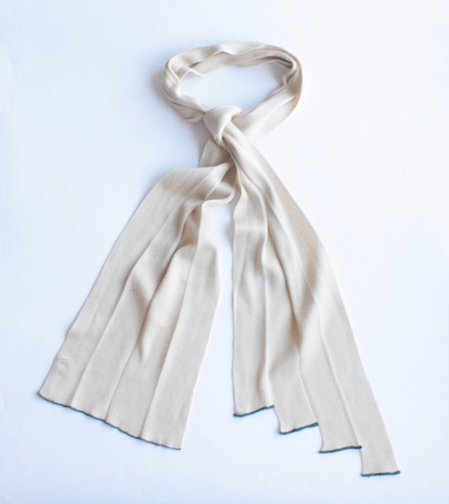 Niezwykle oryginalny kremowy szal o asymetrycznie wykończonych brzegach. Ciekawy, plisowany fason. Materiał to prawdopodobnie mieszanka jedwabiu i bawełny.