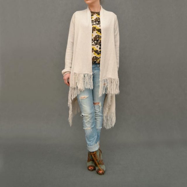 Asymetryczny sweter - narzutka wykończony frędzelkami. Boki dłuższe. Kolor jasnoszarawy beż.