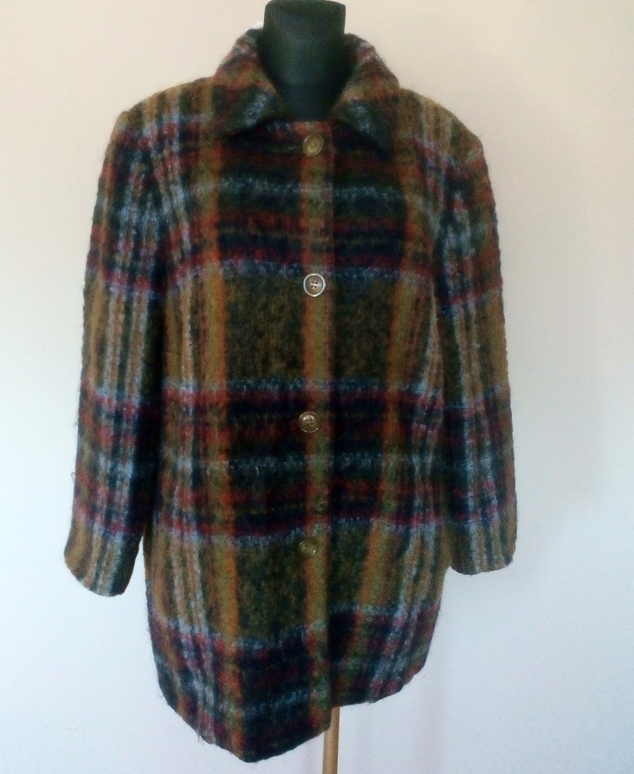 Bardzo ładny krótki płaszcz z wełny typu boucle, materiał w kratę, piękną kolorystycznie, płaszcz zapinany na cztery guziki, z przodu pionowo wpuszczane kieszenie, od wewnątrz jedna kieszeń zapinana na guzik, na ramionach poduszki, od środka dopasowana kolorystycznie podszewka