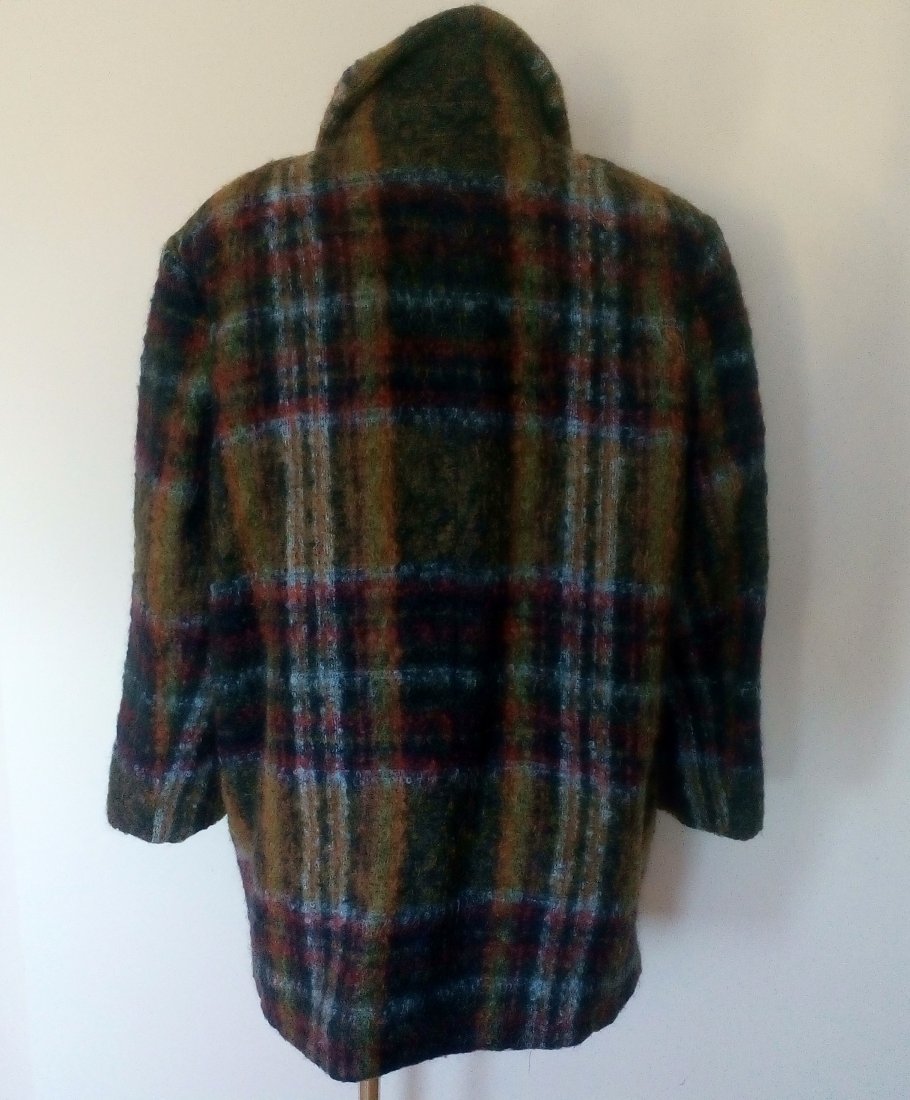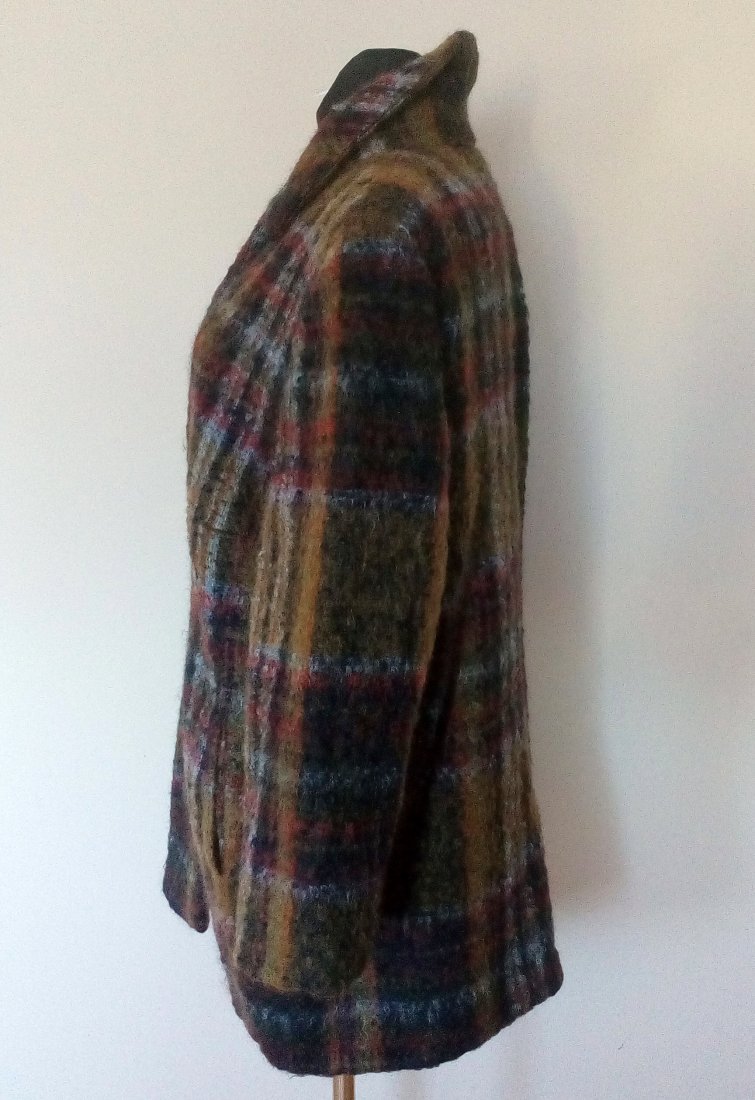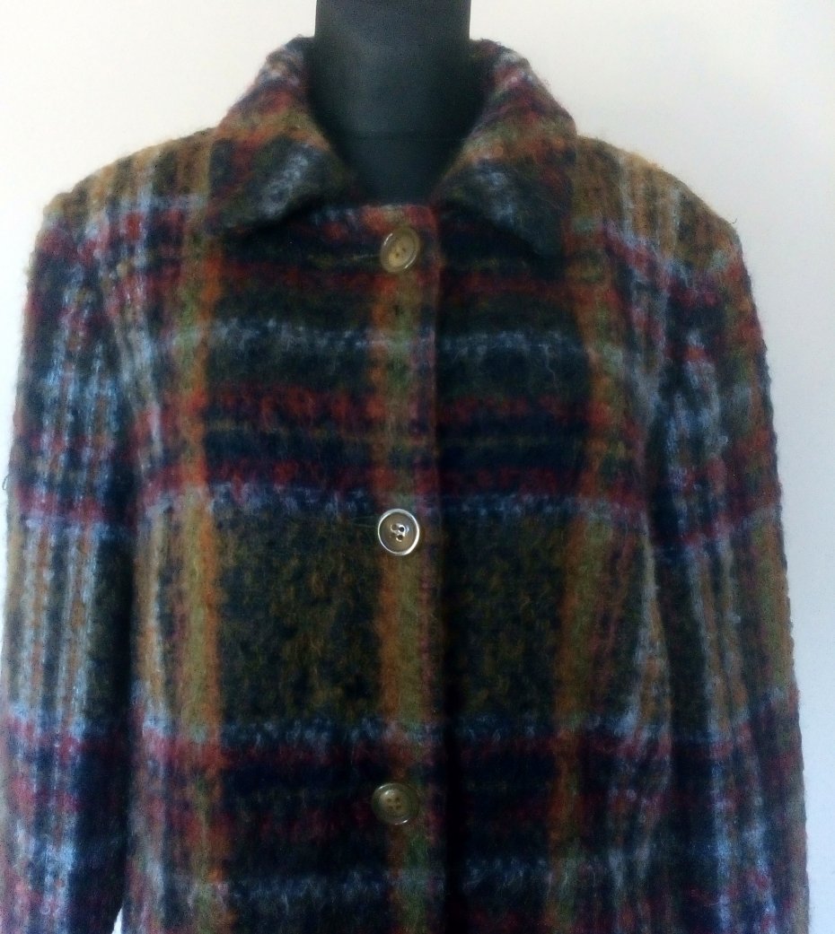 Bardzo ładny krótki płaszcz z wełny typu boucle, materiał w kratę, piękną kolorystycznie, płaszcz zapinany na cztery guziki, z przodu pionowo wpuszczane kieszenie, od wewnątrz jedna kieszeń zapinana na guzik, na ramionach poduszki, od środka dopasowana kolorystycznie podszewka