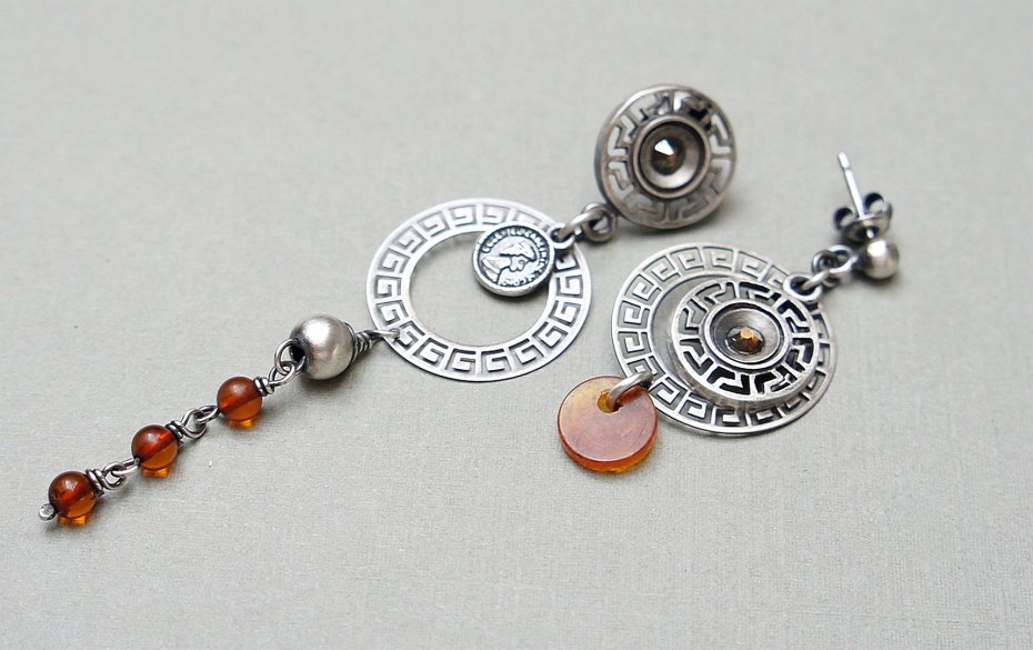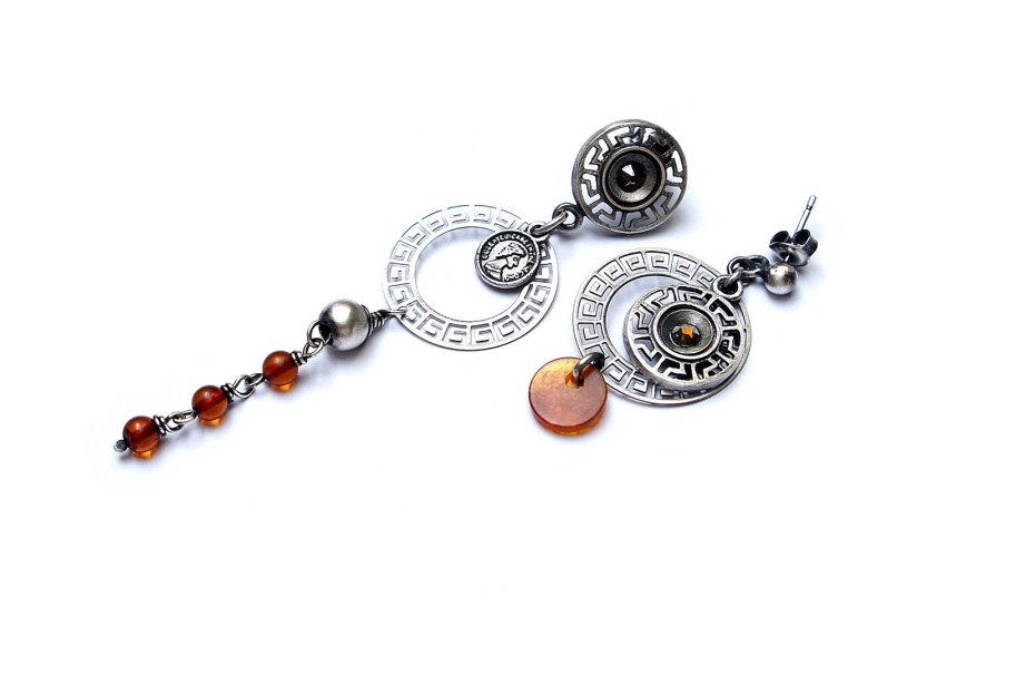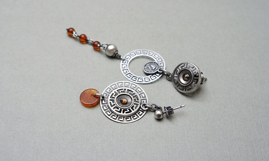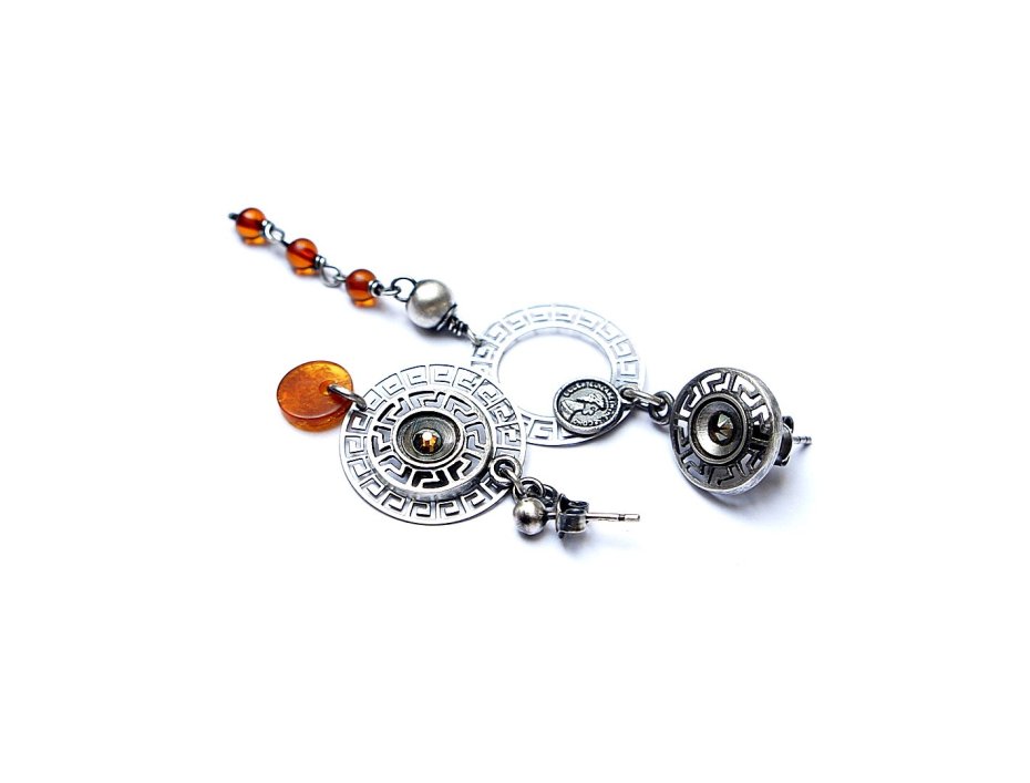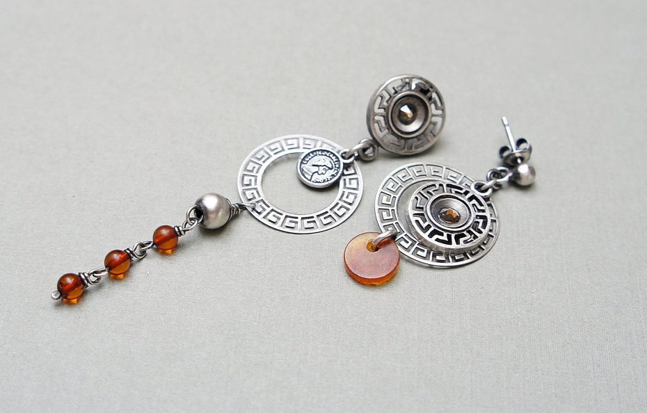 Asymetryczne kolczyki wykonane ze srebra [pr. 925] w połączeniu z kuleczkami bursztynów [4mm],kryształkami Swarovski zatopionymi w ażurowych rozetach, srebrną imitacją monety oraz bursztynową monetką [8mm]. Całkowita długość kolczyków 7,8cm i 4cm. Biżuteria ozdobnie zapakowana.