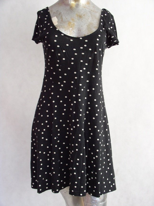 Prosta,miękka sukienka firmy atmosphere.Rozmiar 10,nasz 36-38.Materiał -metka obcięta,wygląda na miękką bawełnę.Dekolt okrągły.Odcięta w pasie.Małe rękawki.Stan ogólny dobry+.Długość 89 cm.pod pachami 80 cm.