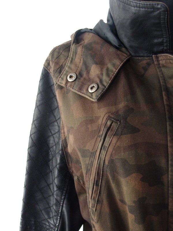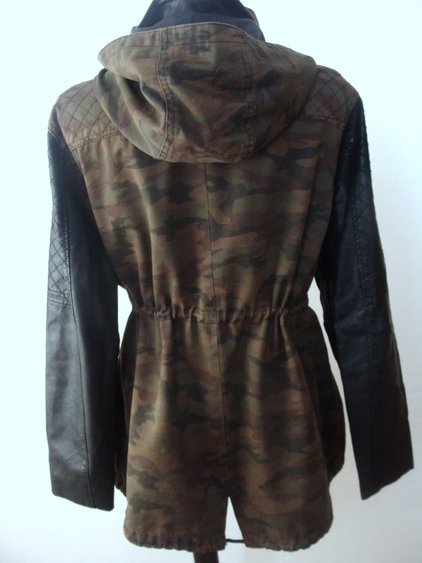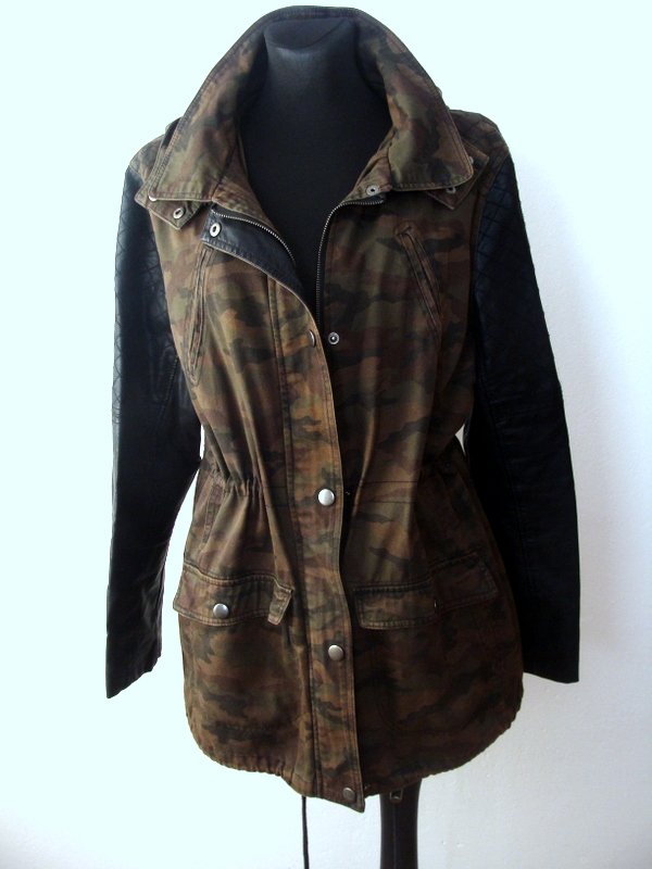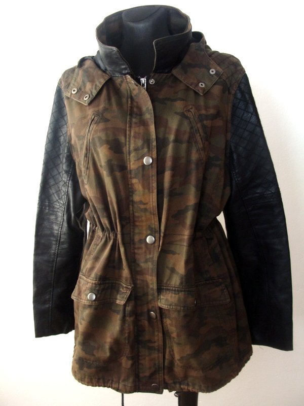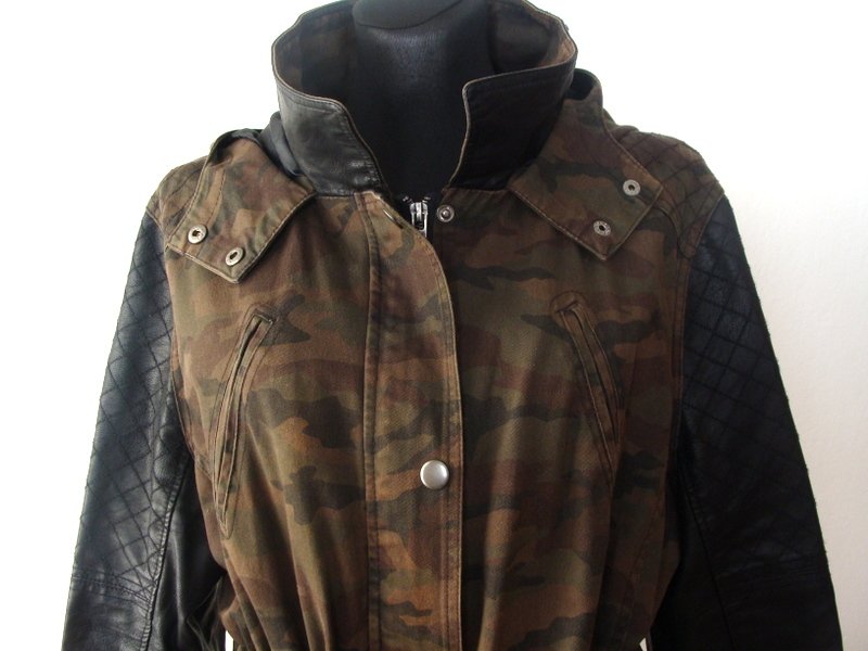 Fajna kurtka typu parka z bawełnianej tkaniny z wzorem moro w brązach , zieleni i czerni z rękawami i dodatkami z czarnej skóry ekologicznej. Z kapturem, w talii i dołem ściągana troczkami ze stoperami. Zapinana na zamek ukryty pod plisą zapinaną na napowe guziki. U dołu dwie naszywane kieszenie z patkami . Całość na podszewce