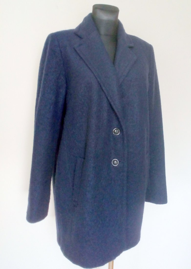 Granatowy, klasyczny płaszcz zapinany na dwa guziki, z przodu ukośnie wpuszczane kieszenie z listwami, na ramionach poduszki, od środka podszewka