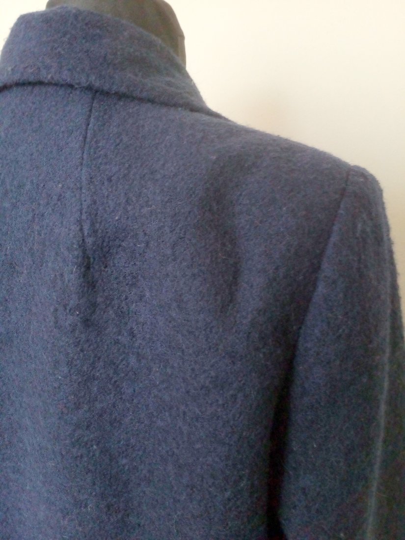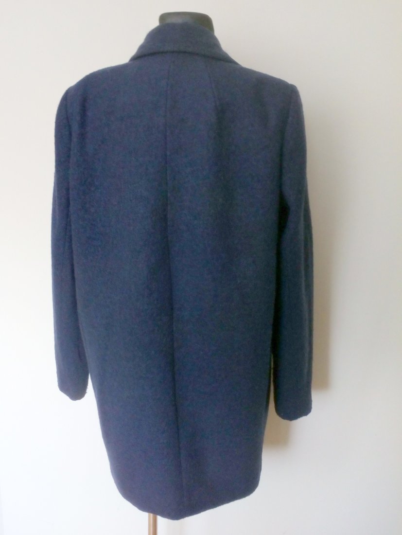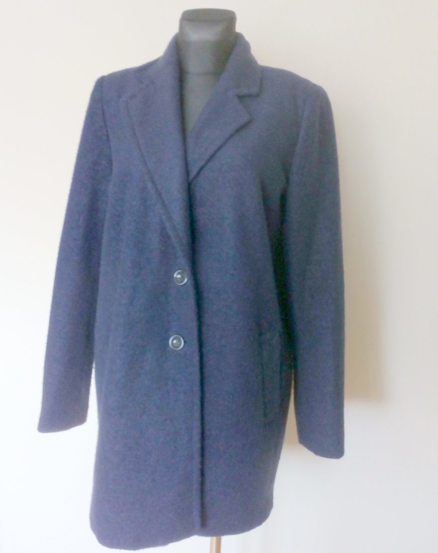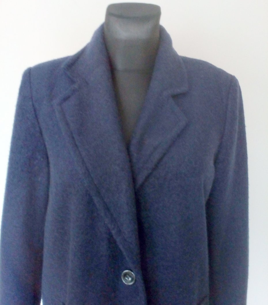 Granatowy, klasyczny płaszcz zapinany na dwa guziki, z przodu ukośnie wpuszczane kieszenie z listwami, na ramionach poduszki, od środka podszewka