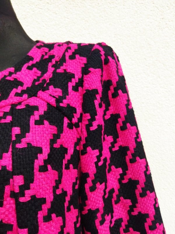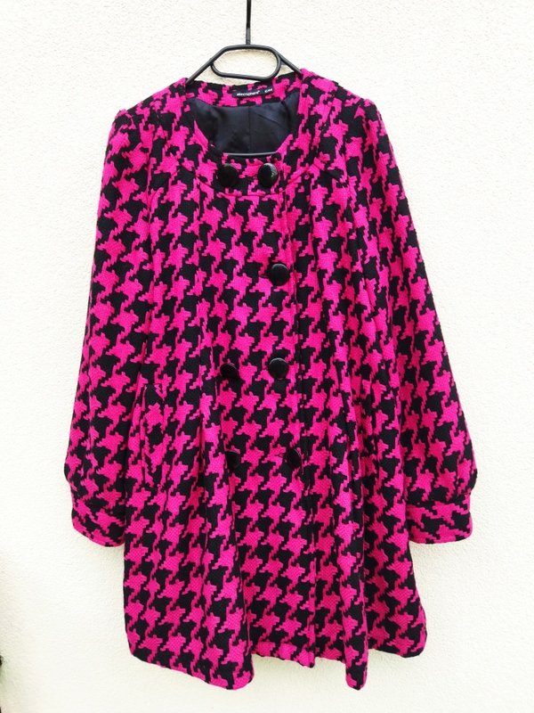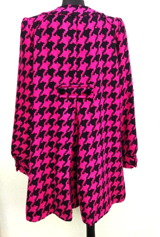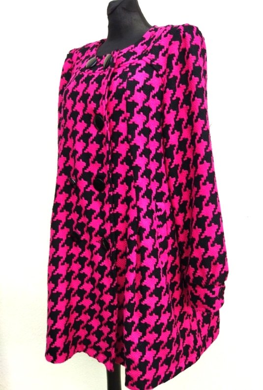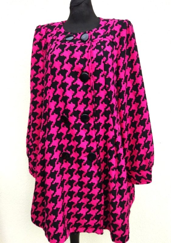 Świetny ponadczasowy płaszcz z dobrej jakości ciepłej tkaniny z wełną z wzorem w dużą kurzą stopkę w kolorystyce czerni i dojrzałej maliny. Bez kołnierz , z dwiema wpuszczanymi kieszeniami, mankiety z mankietem zapinanym na guzik . Trapezowy fason rozkloszowany kontrafałdami z przodu po jednej z każdego boku zaszywanymi do linii bioder, z tyłu jedna zaszywana do linii patki z dwoma guzikami. Dwurzędowy zapinany na duże czarne guziki ( wszystkie kompletne na zdjęciu jednego brak ). całość na podszewce. Ładniejszy w realu.