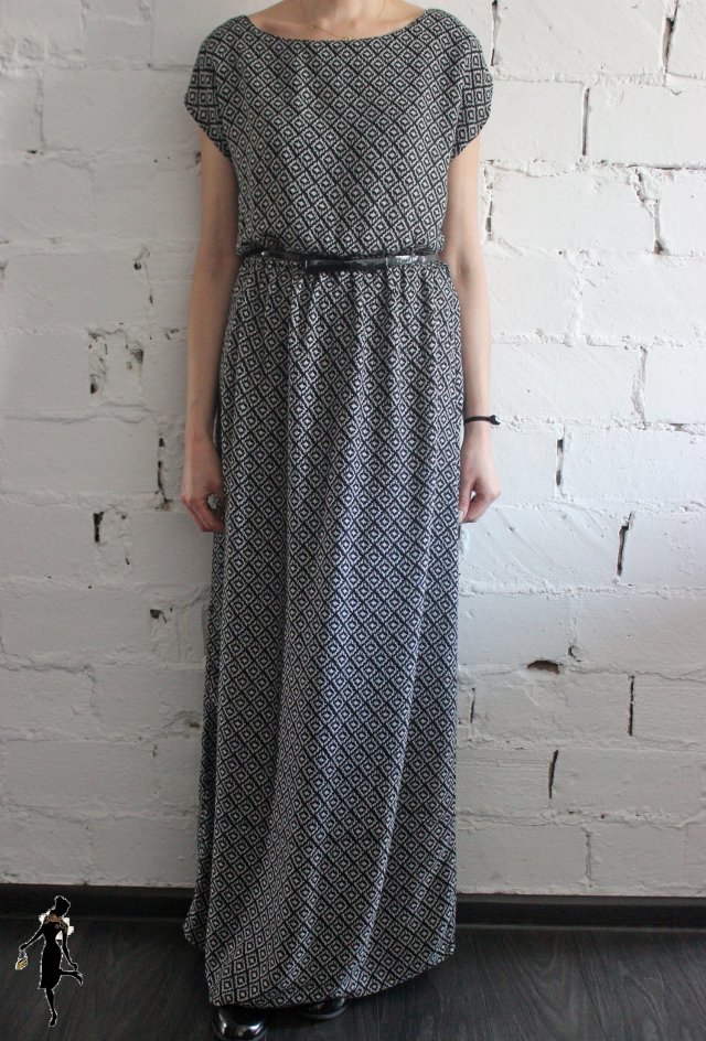 Sukienka długa, marszczona w pasie. Firma Atmosphere. Rozmiar z metki 40/L. Wymiary: obwód biustu- 52cmx2, obwód pasa-52cmx2 (regulowany gumką), obwód bioder-60cmx2, długość sukienki-150cm. Skład materiału: 100% wiskoza.