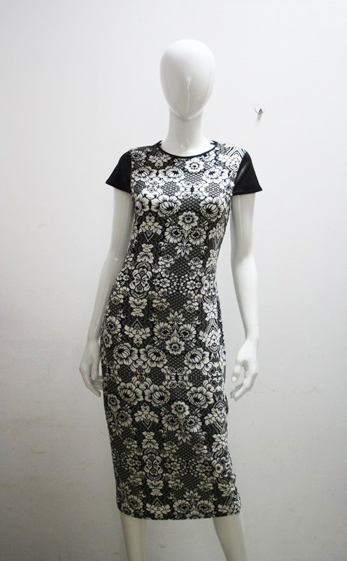 Urocza sukienka w kwiaty. Elastyczna, podkreślająca sylwetkę. Rękawki oraz lamówka przy szyi wykonana z elastycznego,cienkiego materiału imitującego skórę.