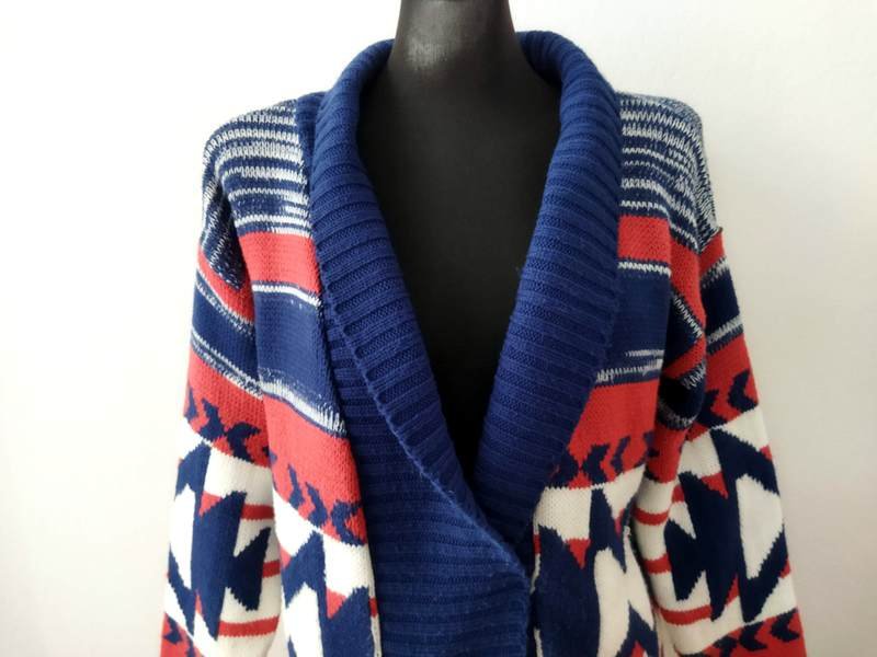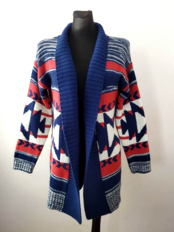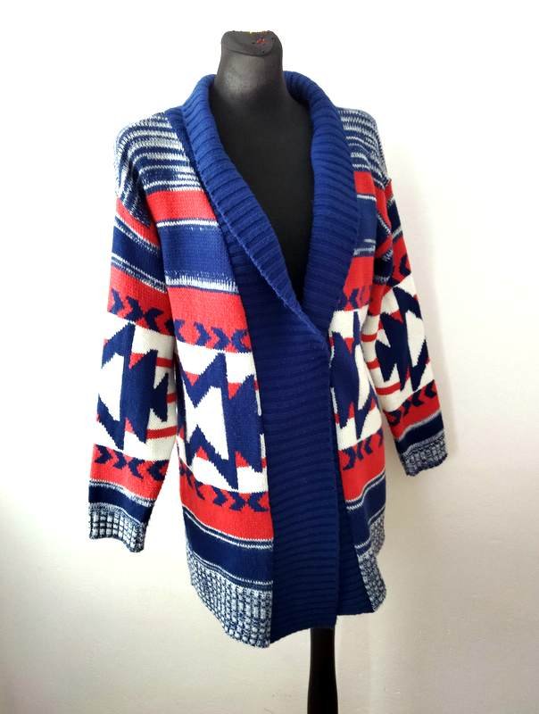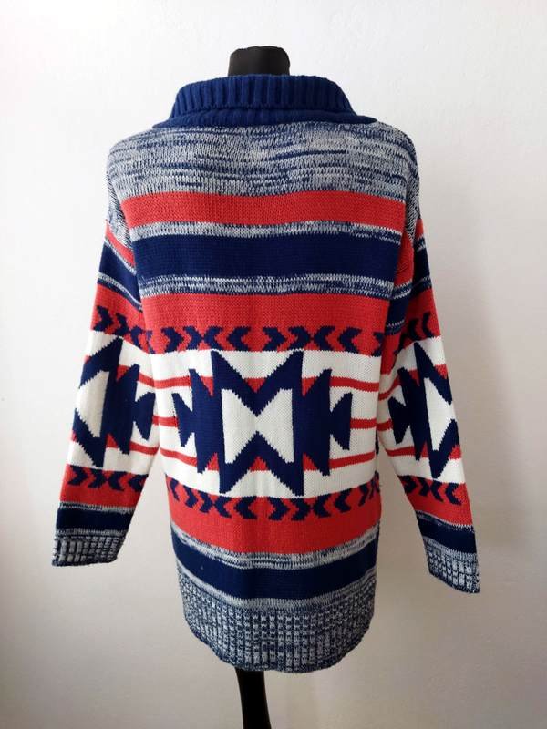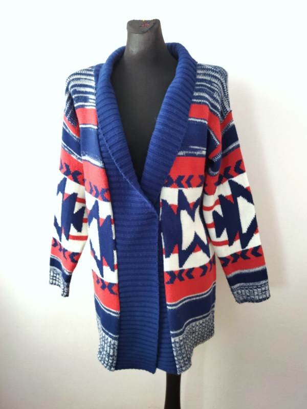 Dłuższy sweter z akrylowej włóczki w etniczne wzory w kolorystyce kobaltu, czerwieni i bieli. Fason otwarty z szalowym kołnierzem. Wykończony ściągaczami.