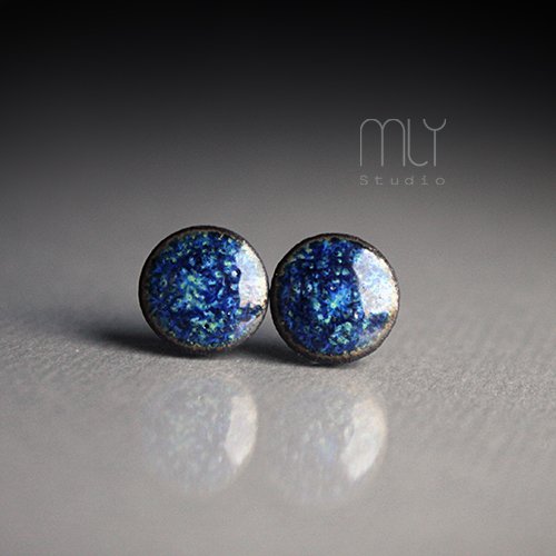 Ceramiczne okrągłe kolczyki w formie sztyftów, ręcznie wykonane z delikatnej czekoladowobrązowej gliny kamionkowej, jednostronnie szkliwione mieszanką błękitnych i zielonych szkliw z efektem plamek, na antyalergicznych sztyftach w kolorze srebrnym. Średnica ok. 9mm. Polecam