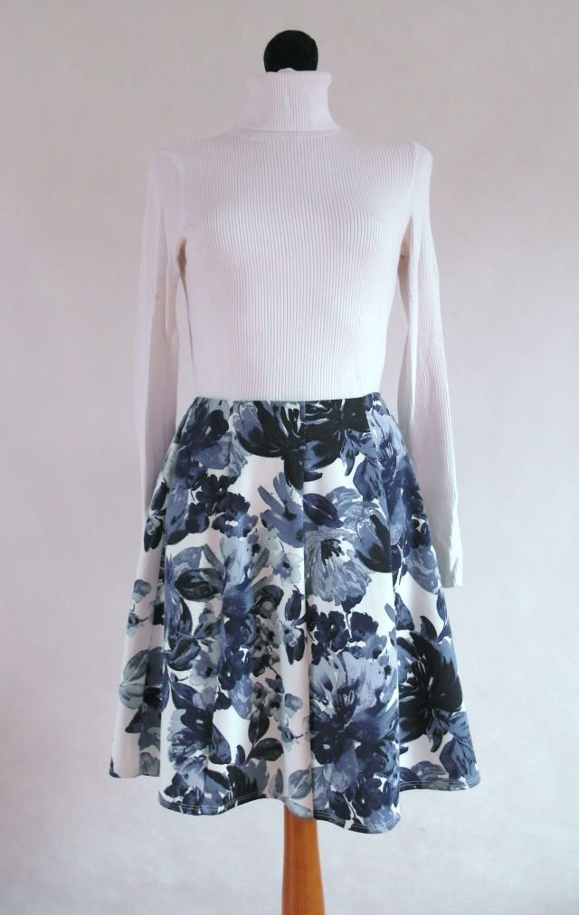 kolor - złamana biel i kwiaty w odcieniach chłodnego, atramentowego granatu. uszyta z klinów, lekko rozkloszowana. Z tyłu na suwak.