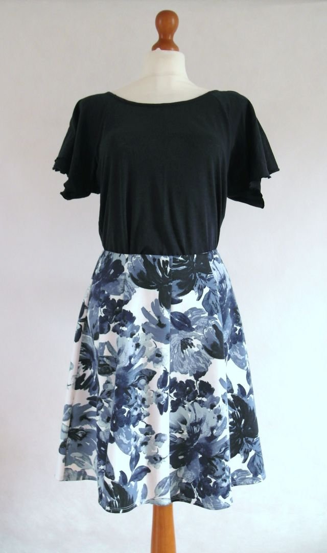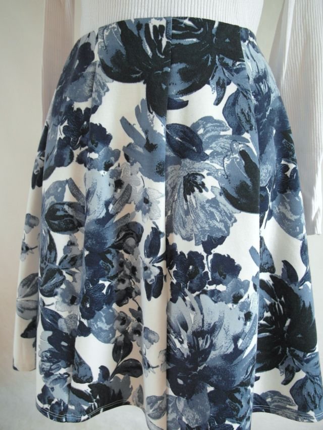 kolor - złamana biel i kwiaty w odcieniach chłodnego, atramentowego granatu. uszyta z klinów, lekko rozkloszowana. Z tyłu na suwak.