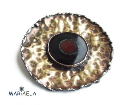 Mosiądz młotkowany, fakturowany i patynowany. Średnica tarczy 8,5 cm.