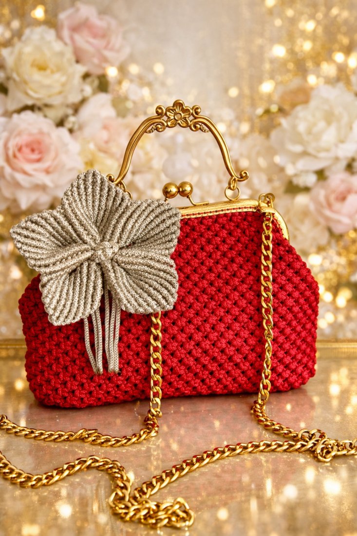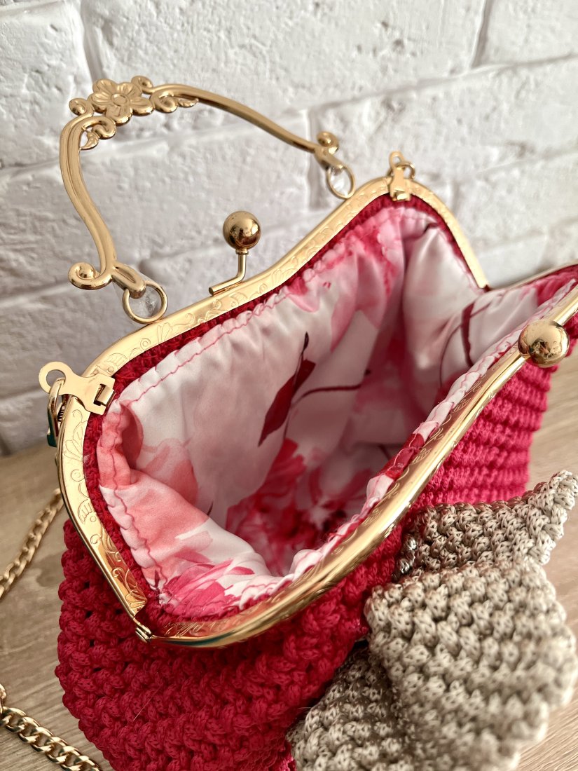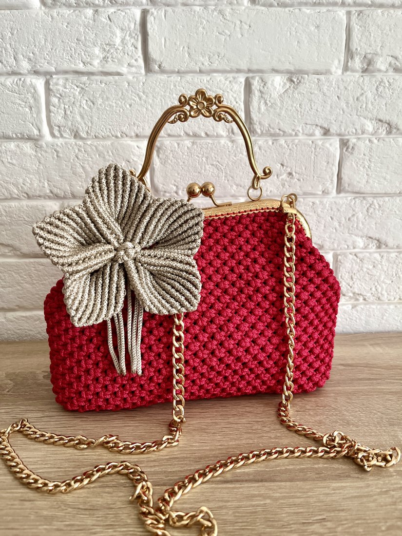 Ręcznie pleciona torebka splotami makramy w głębokim amarantowym odcieniu zachwyca elegancją i wyrazistym charakterem. Złote zapięcie i delikatny łańcuszek nadaje jej ponadczasowej klasy a misternie upleciony kwiat stanowią subtelny, dekoracyjny akcent. Całość dopełnia wyjątkowa, starannie dobrana podszewka, co sprawia że torebka również zachwyca wewnątrz.