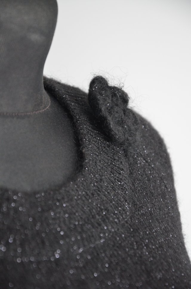 Elegancki włoski sweterek marki AURORA. Czarny, z dodatkiem srebrnej nici. Moherowy. Dekolt okrągły, ozdobiony dzianinową różyczką. Z przodu kangurkowa kieszeń. Rękawy długie. Lekki. Dzianina elastyczna.