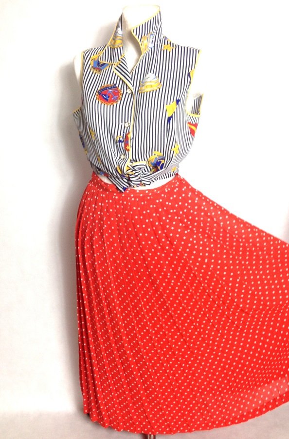 Przepiękna spódnica w klimacie retro o fasonie rozkloszowanym, plisowana, kolor czerwony w białe grochy, na podszewce, zapinana na suwak i guziczek.