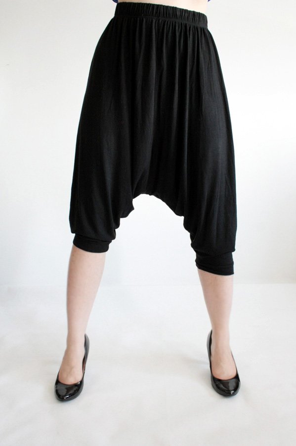 Czarne, luźne spodnie typu alladynki skandynawskiej marki The Masai. W talii wszyta guma. Obwód w biodrach jest uniwersalny dzięki obszernemu fasonowi.