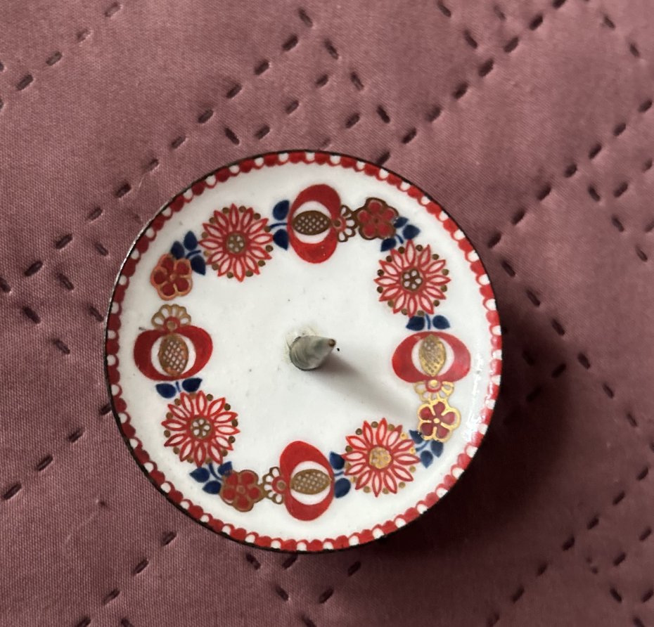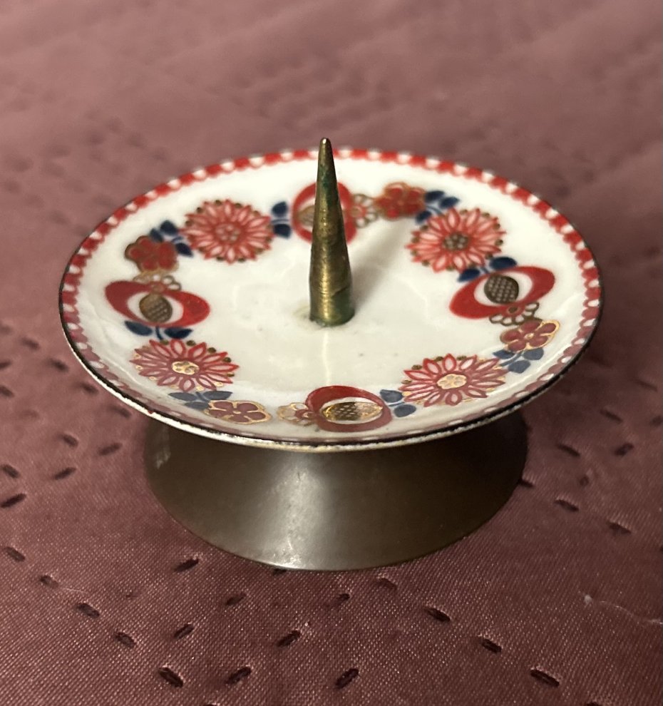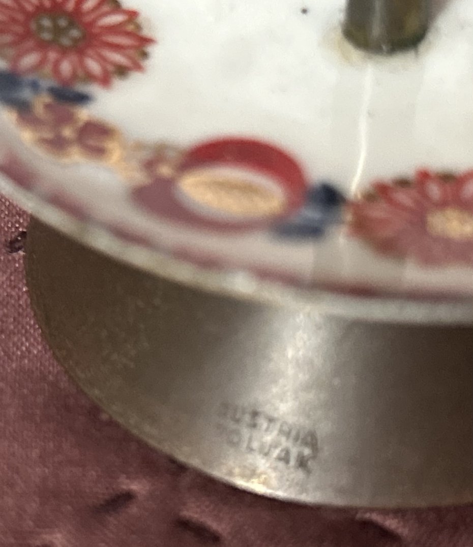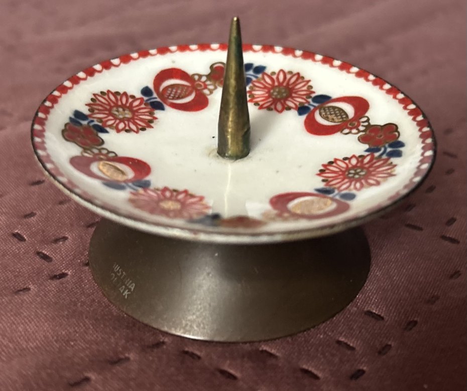 Austria, niespotykany świecznik na jedną świecę. Sygnowany ( Austria i niezbyt czytelny - Polvoc ?) . Malowana emalia - żywe barwy szczypta złota . Mosiądz . Średnica 6 cm podstawa trochę ponad 4,5 cm wysokość 2,5 plus szpic na świecę - wysokość całkowita 4,5 cm . Stan zachowania dobry . Drobne ślady użytkowania i wady wykonania .