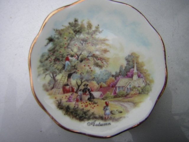 Malutki spodek porcelanowy z reprodukcją Autuum. Sygnowany FINE BONE CHINA MADE IN ENGLAND. Pastelowy nadruk, na błyszcząco szkliwiony. Rant falbanowankowy, złocony. Doskonały do kolekcji :) Obfitość jesienna.