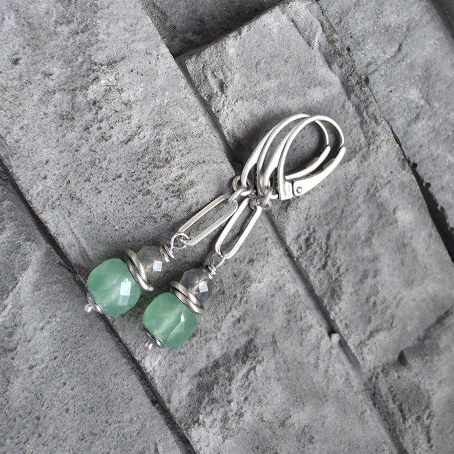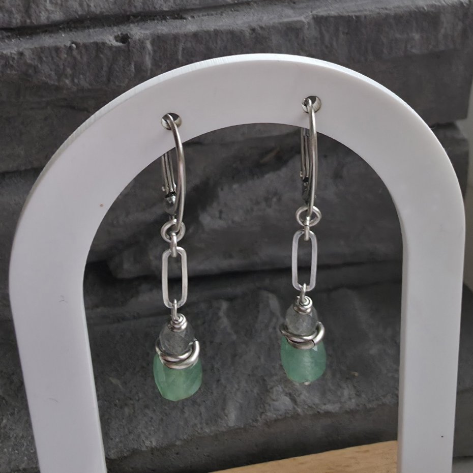 Nowoczesne i minimalistyczne kolczyki wykonane w całości z oksydowanego srebra próby 925 oraz oszlifowanych kostek zielonego awenturynu wielkości ok 7 mm i kulek labradorytu wielkosci 5 mm. Zapięcia zatrzaskowe typu angielskiego. Całkowita długość kolczyków to ok. 4,8 cm. W mojej galerii bransoletka do kompletu. Ozdobnie zapakowane.