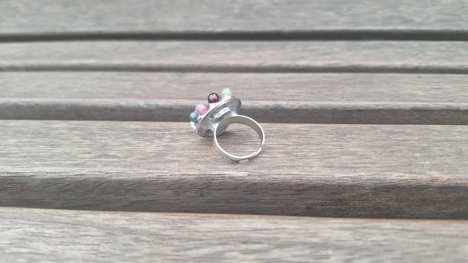 Pierścionek wykonany z miedzi, cyny, turmalinów i awenturynu. Wymiary ok. 1.8 na 1.8 cm. Regulowany. Nie jest ciężki.