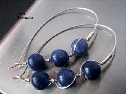Kolczyki wykonane z kuleczek awenturynu granatowego oraz srebra próby 925. Długość kolczyków wynosi 4,5 cm.