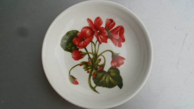 Porcelanowy talerzyk sygnowany jakością AYNSLEY CHELSEA Made in England Fine Bone China z rzadko spotykanej serii FLOWERS. Półgłęboka forma i wzór kwiatowy w żywych barwach, tu -pelargonia . Ciepła biel porcelany; błyszczące szkliwienie.