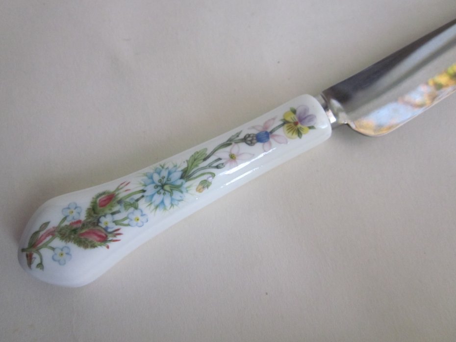 Rarytas Metalowo -Porcelanowy z urzekającej i cenionej kolekcjonerskiej serii Wild Tudor, sygnowana najwyższą jakością jedwabistej szlachetnej porcelany Aynsley. Poetycki, uroczy wzór z kwiatów z dzikiego angielskiego ogrodu - jest czarnuszka, dzika róża, goździk, bratek, niezapominajka, chaber, nawet maciejka :)) Najwyższa klasa i niezaprzeczalna elegancja. Błyszczące szkliwienie i delikatne ryflowanie rantu rączki. Metal szlachetny z sygnaturą AYSLEY Stainless Steel England. Ząbki na ostrzu noża.