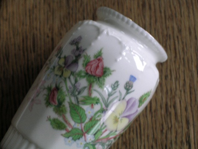 Wazonik z urzekającej i cenionej kolekcjonerskiej serii Wild Tudor, sygnowana najwyższą jakością jedwabistej szlachetnej porcelany Aynsley. Poetycki, uroczy wzór z kwiatów z dzikiego angielskiego ogrodu - jest czarnuszka, dzika róża, goździk, bratek, niezapominajka, chaber, nawet maciejka :)) Najwyższa klasa i niezaprzeczalna elegancja. Błyszczące szkliwienie, delikatne ryflowanie dekoracyjne i złocony rant.